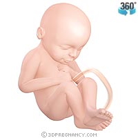 Your baby hasn't gained much weight or height this week, as most of his energy's been channeled to the brain. He weighs about 3 pounds and is approximately 15.5 inches long, about the size of London, not the city, Britney Spears' Yorkie terrier. Of course your baby is less hairy and way cuter!